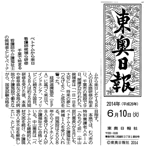 2014.6.10【東奥日報】ベトナムから来日看護師候補ら研修