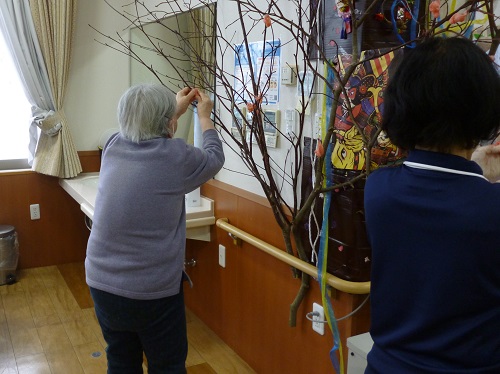 作業レクではお福さんの扇飾りを作りましたよ!
