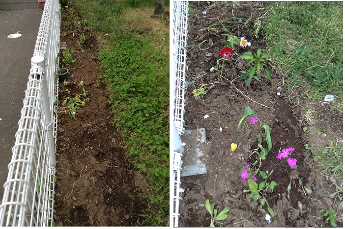 で、満開のマルメロの写真を撮りつつ、フッと下を見ると、何という事でしょう!芝生がいつの間にか花壇になっているではありませんか。昨年はフェンスの下の隙間に植えていた花々が広い花壇に植え替えられていました。