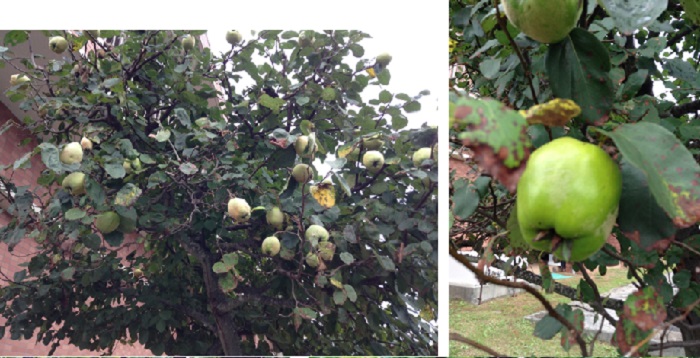 玄関横のマルメロ~少しばかり実成りが良くないように思いますが(?)