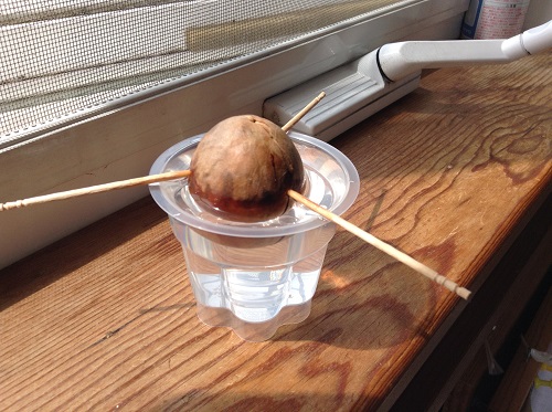 プリンの空容器に水を入れ、串刺しにしたアボガドを浸した状態で、期間にして1ヶ月程度・・・