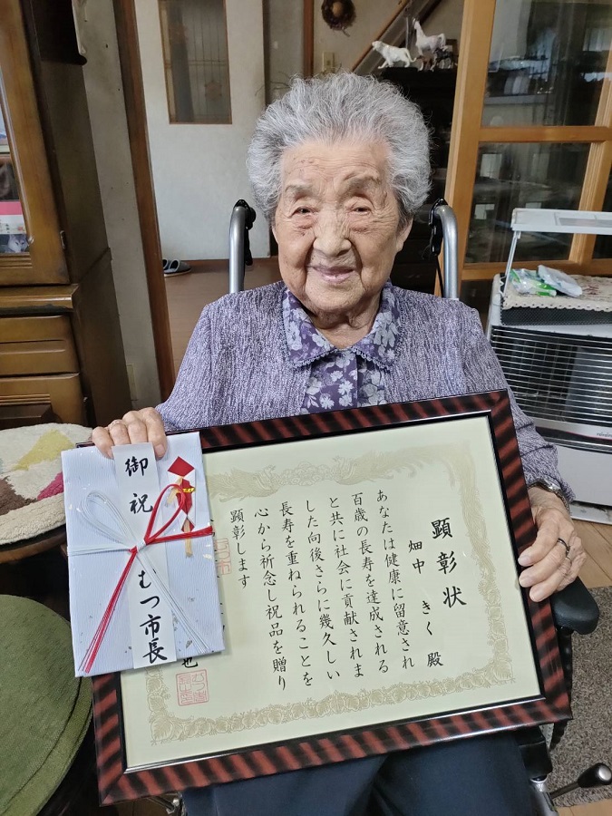 畑中きく様が百寿を迎えられむつ市長がお祝いに訪問されたようです。担当ケアマネジャーが訪問すると笑顔で顕彰状と御祝を見せてくださいました。素敵な笑顔に癒されます。