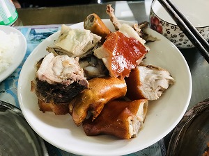 子豚は大きな包丁で骨ごと切り分けます 未熟なジャックフルーツの炒め物 揚げ春巻き